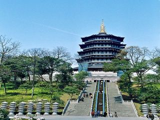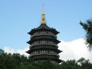 雷峰塔原建造在夕照山峰上,位于杭州西湖南岸南屏山日慧峰下净慈寺前。雷峰为南屏山向北伸展的余脉,濒湖勃然隆起,林木葱郁。但民间因塔在雷峰之上,均呼之为雷峰塔。原塔共七层,重檐飞栋,窗户洞达,十分壮观。